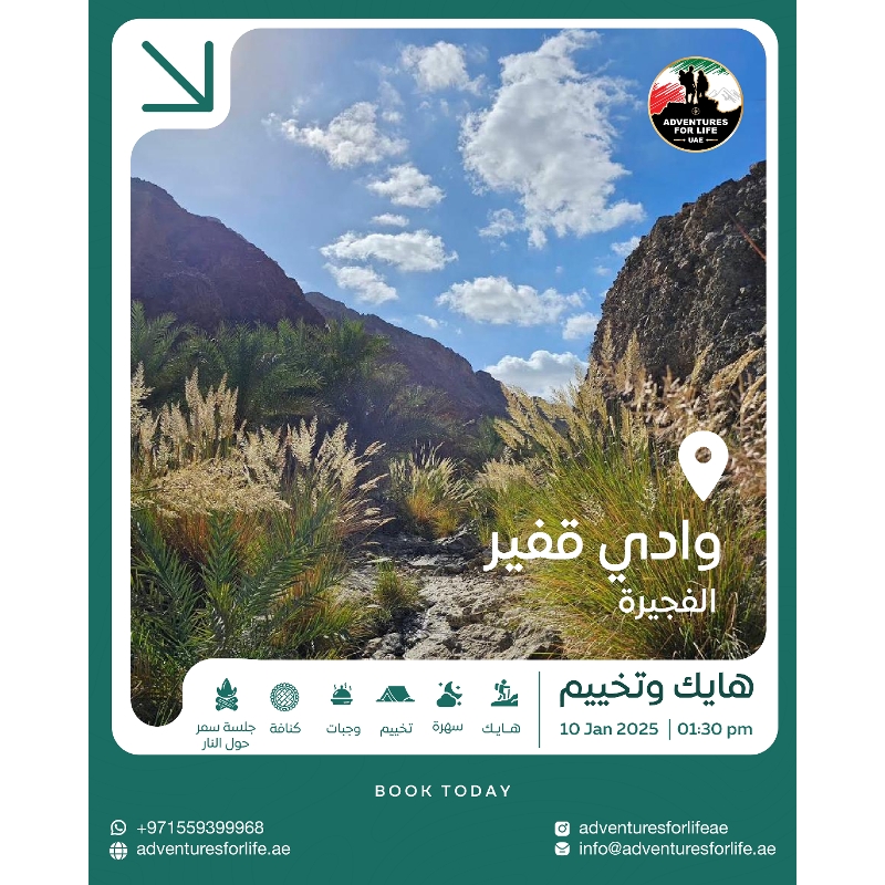 🏞️ مسار وادي قفير عائلة ادفنتشر فور لايف الأعزاء اهلا وسهلا بكم في مغامرة جديدة حيث المناظر الطبيعية الخلابة والتي ستكون في وادي قفير الذي يتميز بأجوائه الهادئة، حيث يُسمع صوت خرير المياه وأصوات الضفادع وبذلك نضمن لكم الإستمتاع بأجواء الطبيعة والمناظر الخلابة . 📍الموقع :- الفجيرة 🗓️ التاريخ :-10-1-2026 🧷اليوم :- السبت ⏰الوقت :- التجمع الساعة 1:30 مساءً عند نقطة البداية 🎚️المستوى :- سهل الى متوسط ⏱️المدة والمسافة :- يبلغ طول المسار حوالي 6 -7 كيلو ويستغرق من الوقت 4 ساعات . ⸻ 🎒 ما يلزم إحضاره :- • ارتداء ملابس وأحذية مريحة مناسبة للمشي لمسافات طويلة. • كمية كافية من الماء (2–3 لترات على الأقل). • واقي شمس، قبعة، ونظارة شمسية للحماية من أشعة الشمس. • سناك خفيف لتناوله أثناء المسير . عدة التخييم - لمن يرغب بالتخييم (خيمة - سليب باك - ملابس خاصة ) ⸻ 🗓️ جدول الرحلة :- • 🕑 التجمع :- الساعة 1:30 ظهرًا • 🤸♀️ تمارين إحماء قبل المسير • 🚶♂️ الإنطلاق :- الساعة 2:00 ظهرًا • 🌅 العودة :- مع غروب الشمس • 🔥 العودة الى مكان السهرة والتخييم لبدء الفعاليات 🎤 فعاليات السهرة :- - تعارف،ألعاب ،مسابقات، وكاريوكي - عشاء ⸻ 💸 اسعار الهايك مع السهرة :- 🔹 249 درهم (الحجز المبكر حتى 9-1-2026– غير قابل للإسترداد) للهايك فقط 🔹 299 درهم (الحجز العادي) للهايك فقط اسعار التخيم :- 🔹349 هايك مع تخييم للحجز المبكر 🔹399 هايك مع تخييم للحجز العادي ادوات التخييم للإيجار :- - [ ] 80 درهم خيمة كبيرة يمكنك استخدامها لحد 3 اشخاص كبار 👥 الأعمار :- من 10 سنة فما فوق ⸻ 💰 السعر يشمل :- • قائدين محترفين للمسار 🧭 • حقيبة إسعافات أولية ⛑️ • مشروبات ساخنة وباردة ☕🥤 • عشاء (بوفيه) 🍴 • مرافق (تواليت 🚻) • جلسة - كنافة نابلسية . حطب للتدفئة - الإفطار لمن يريد التخييم 🌐 احجز الآن عبر موقعنا: 👉 Adventuresforlife.ae